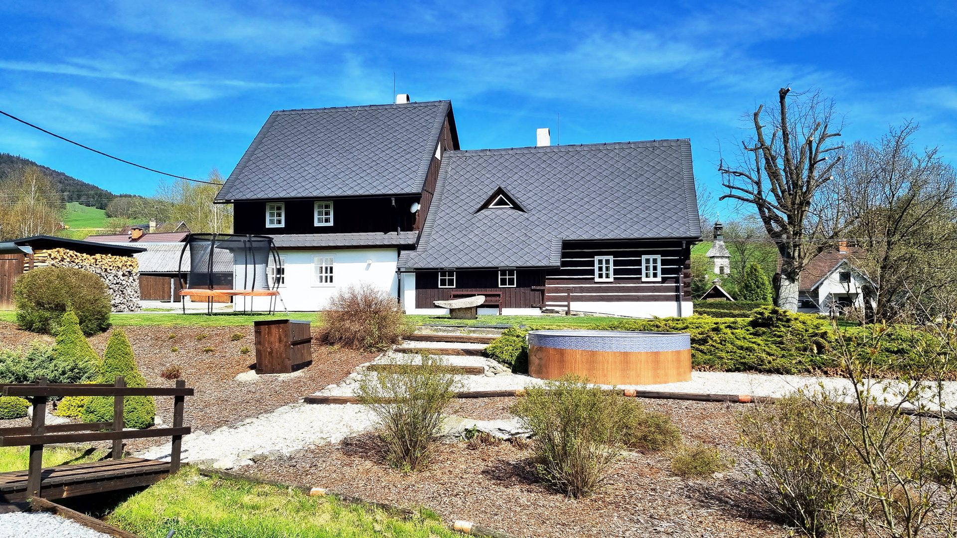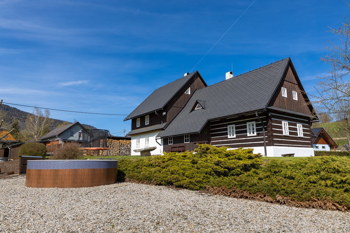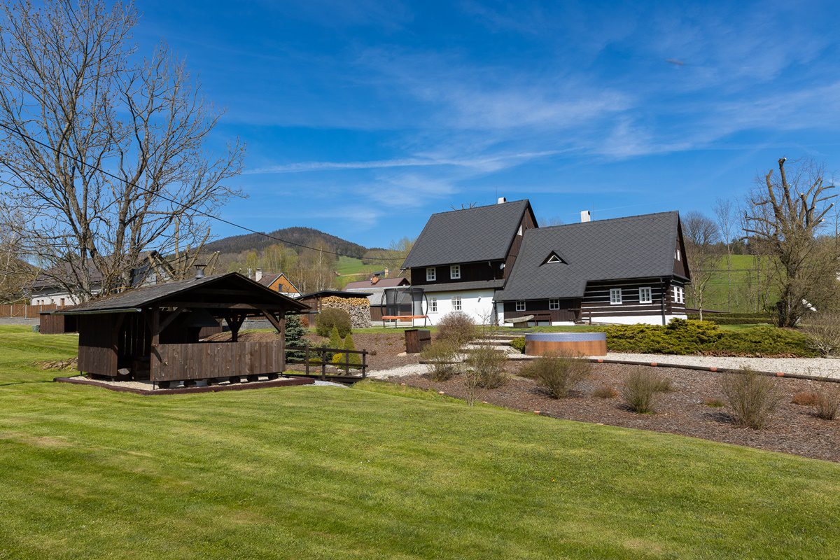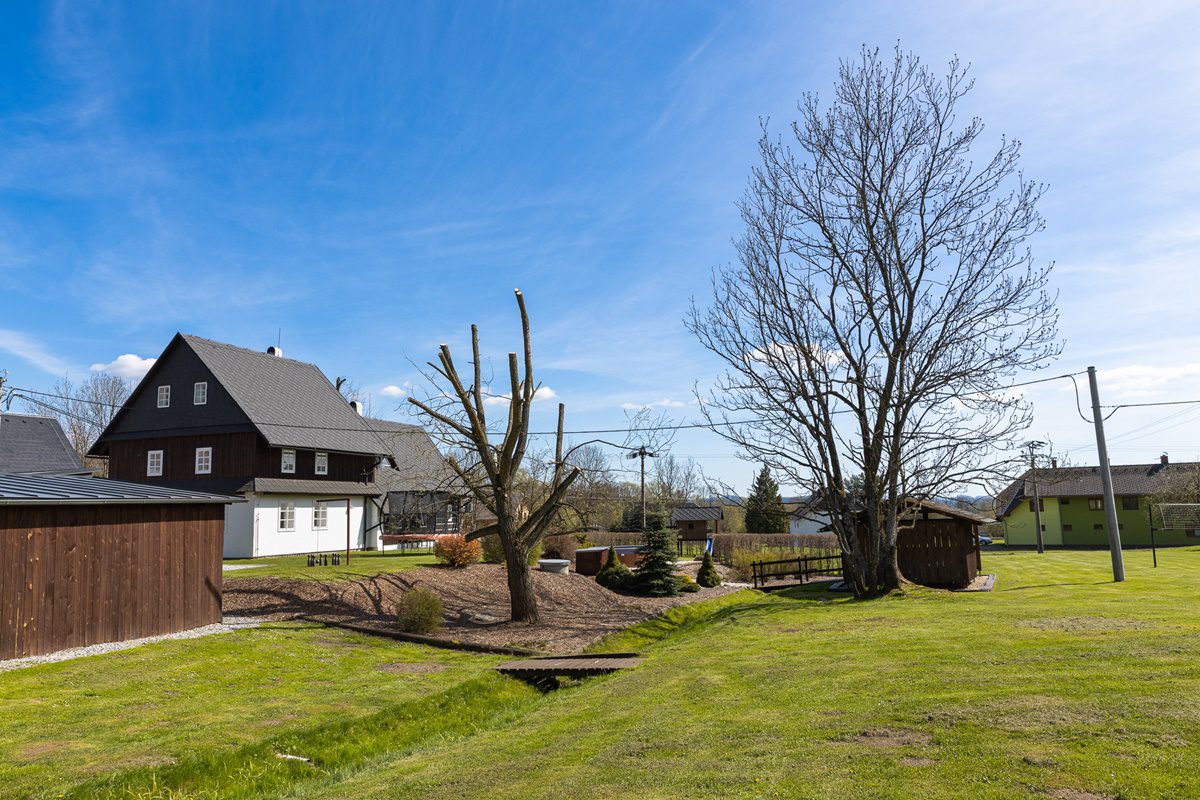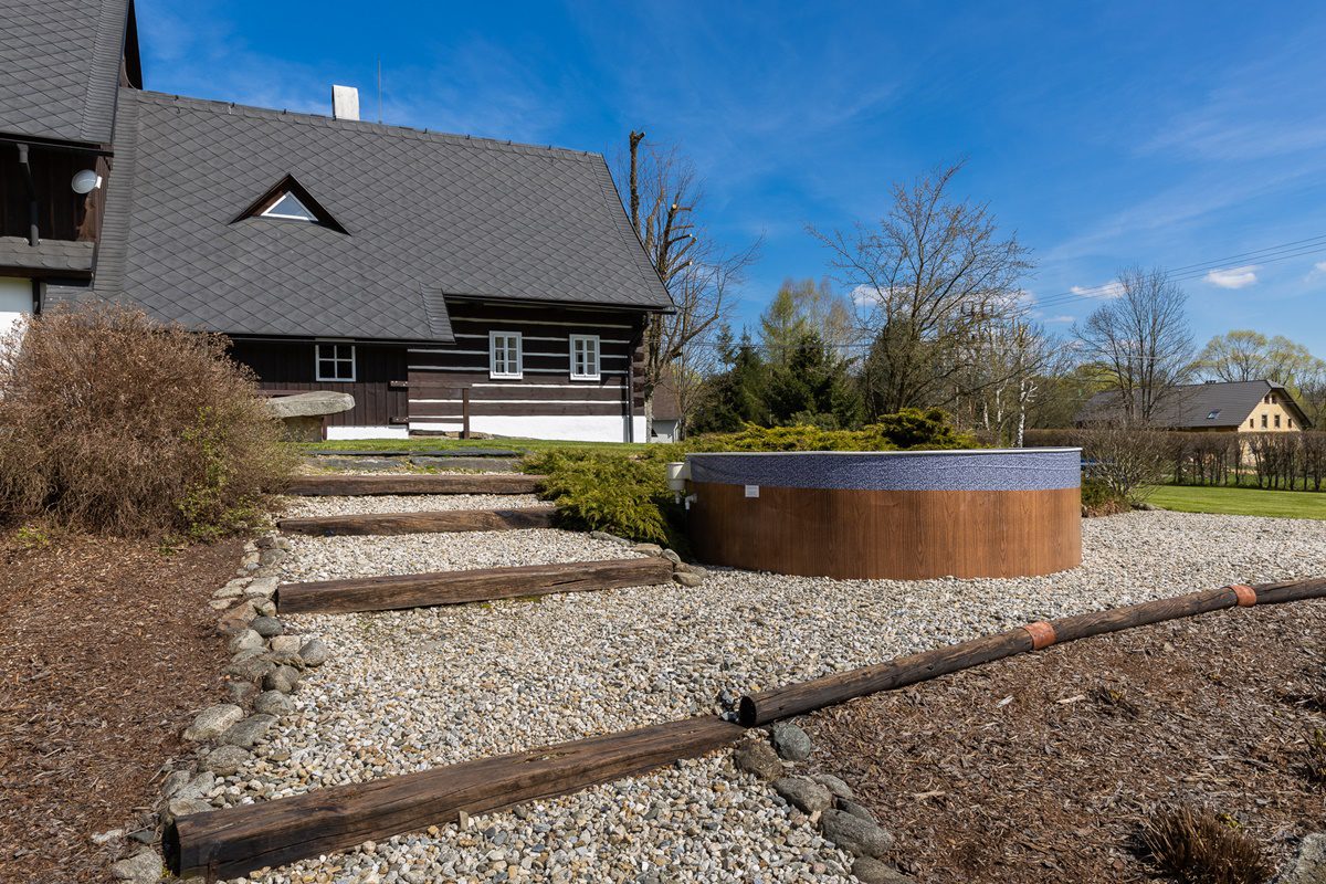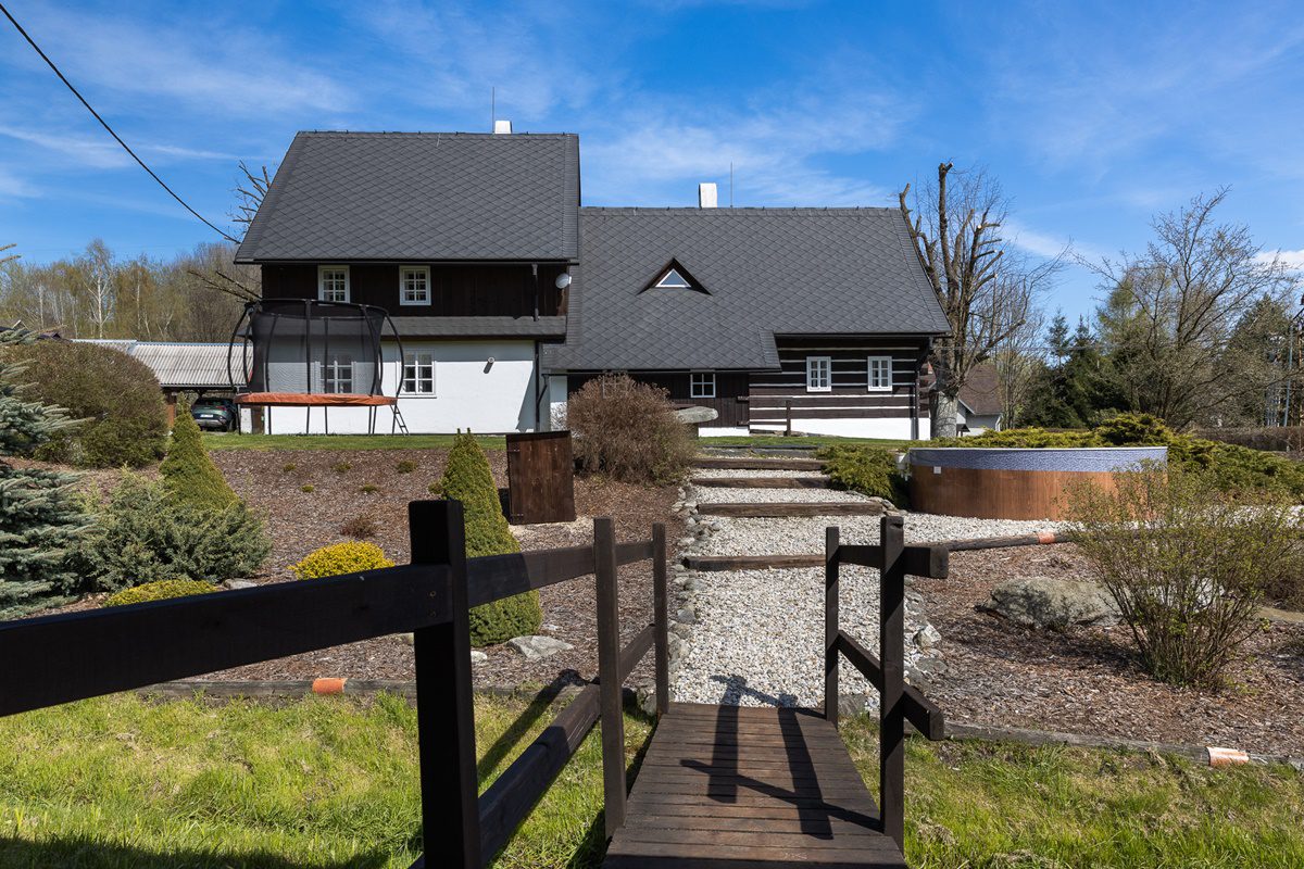Chalupa o zastavěné ploše 131 m2 je zasazena v udržované zahradě, jež nabízí dokonalé soukromí a sportovní vyžití. Zahrada o celkové výměře 5.362 m2 má vlastní vjezd a nabízí až 8 soukromých parkovacích míst.