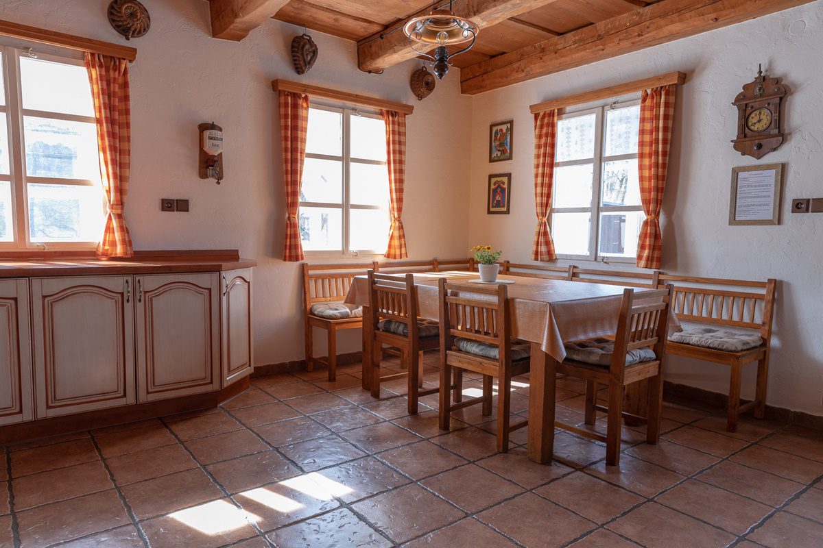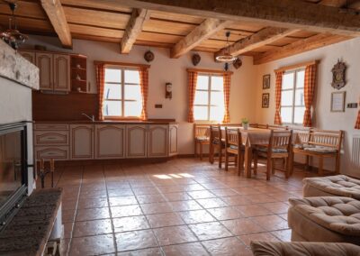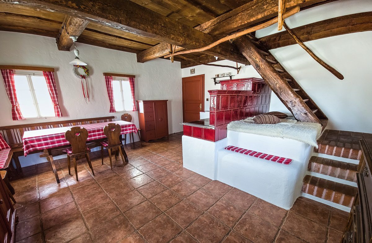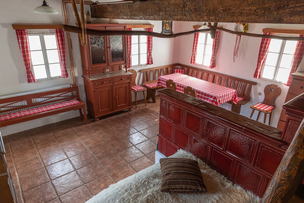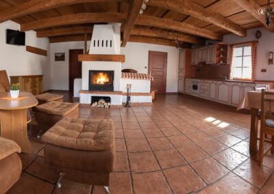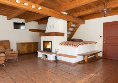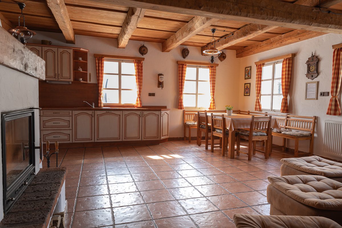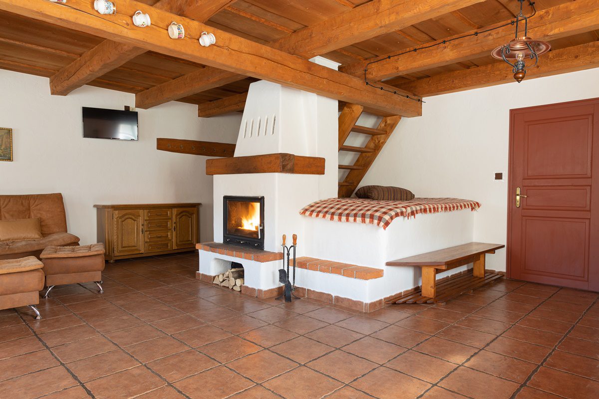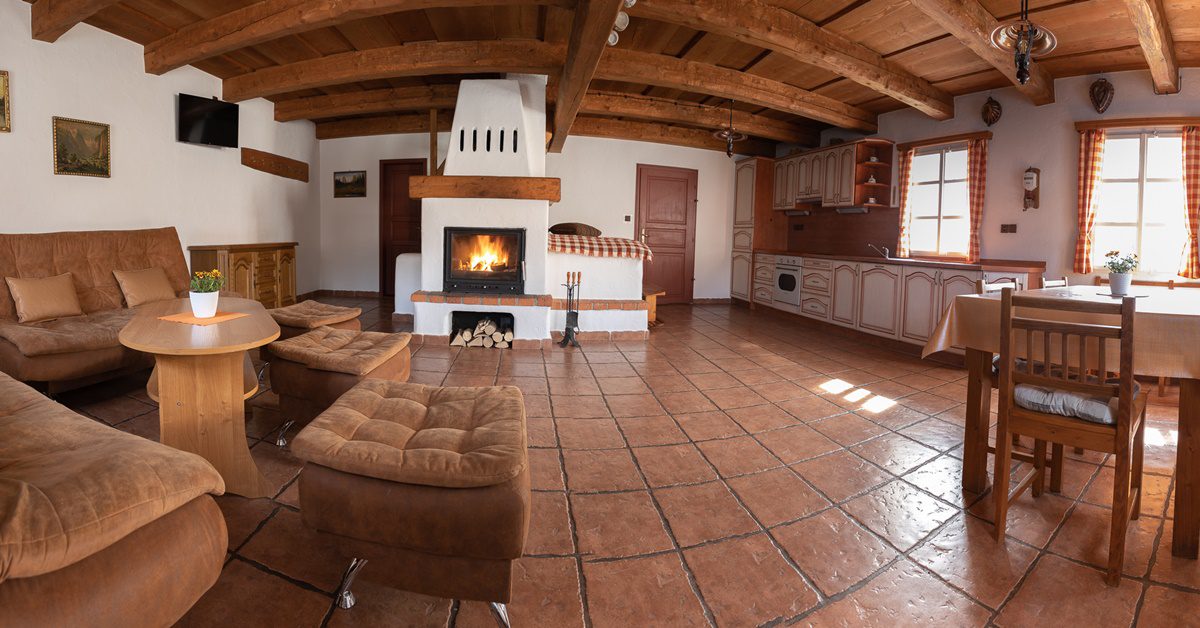 Přízemí – obývací pokoj v selském stylu s kachlovými kamny a pecí k odpočinku plus kuchyňský a jídelní kout