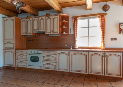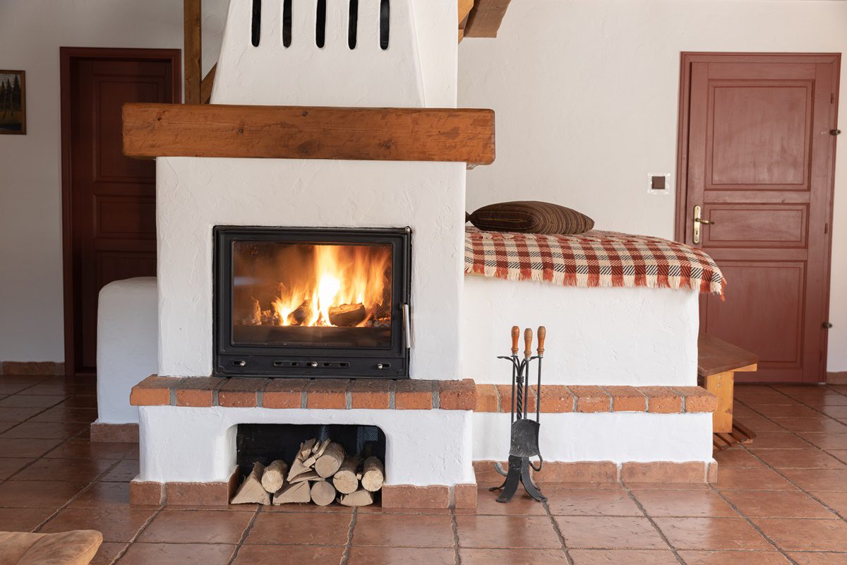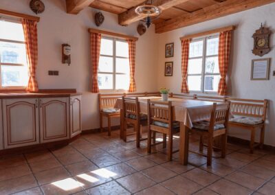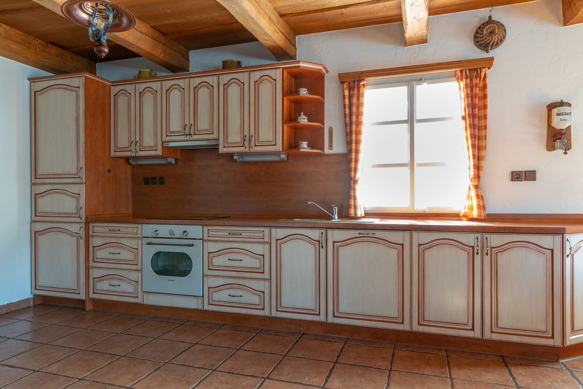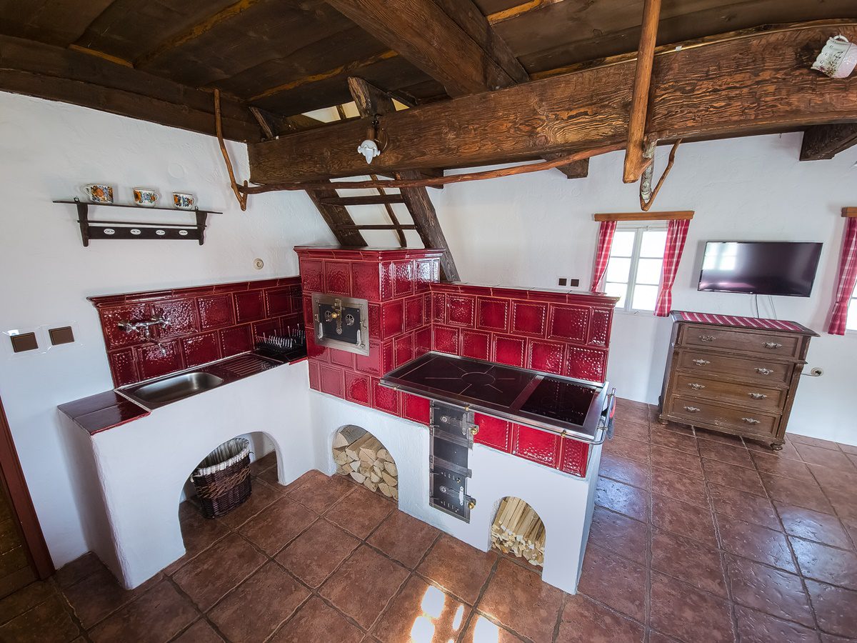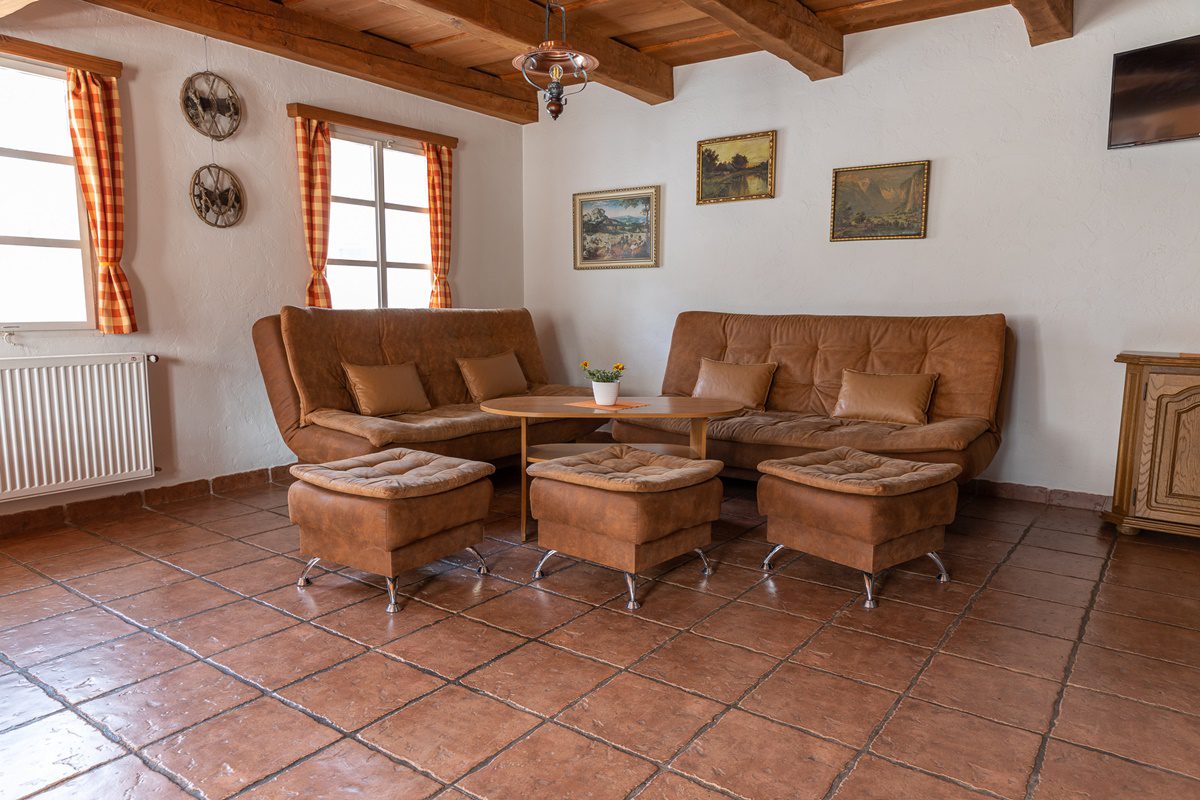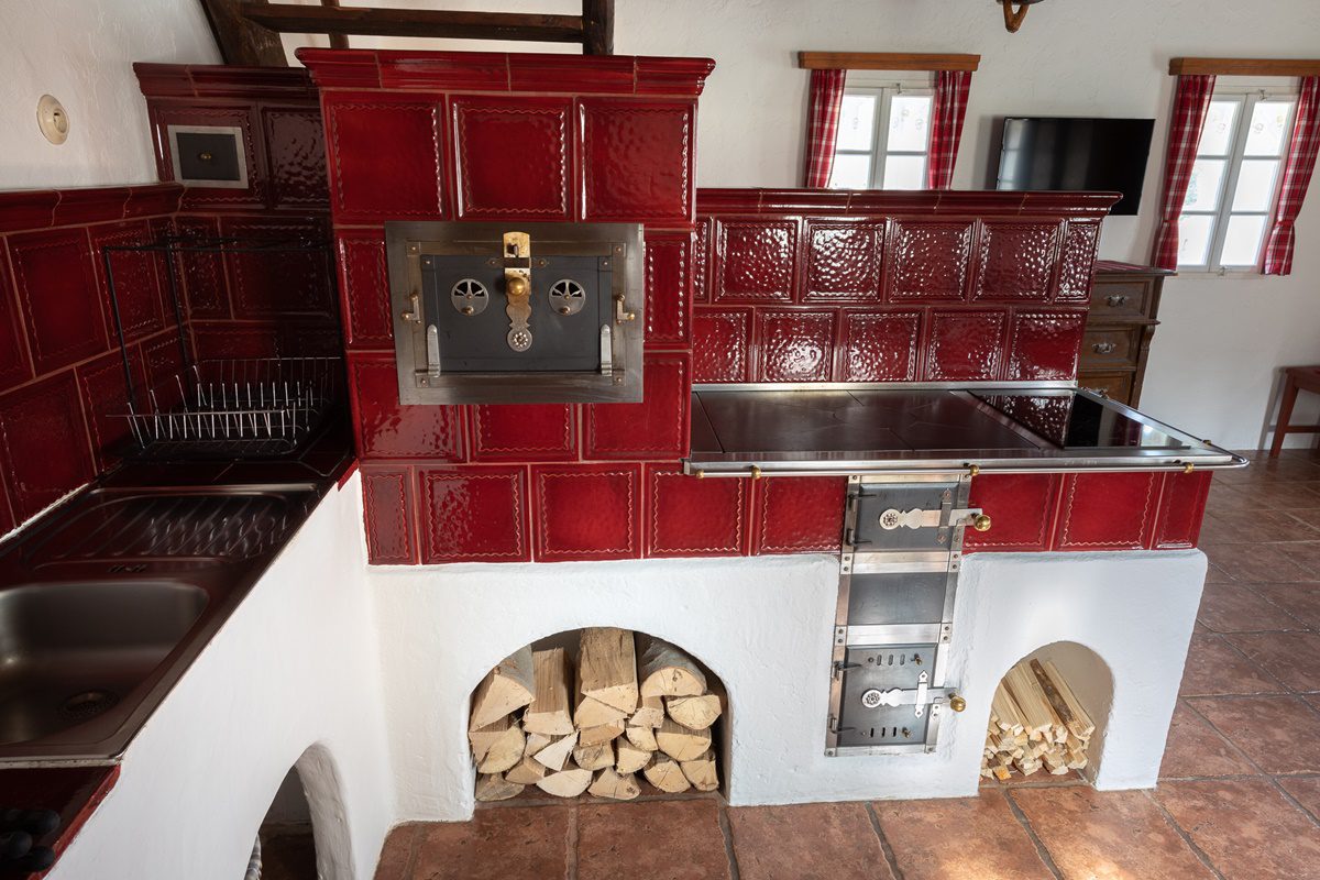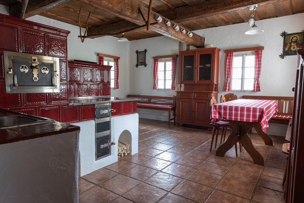 Přízemí – obývací pokoj v selském stylu s kachlovými kamny a pecí k odpočinku plus kuchyňský a jídelní kout