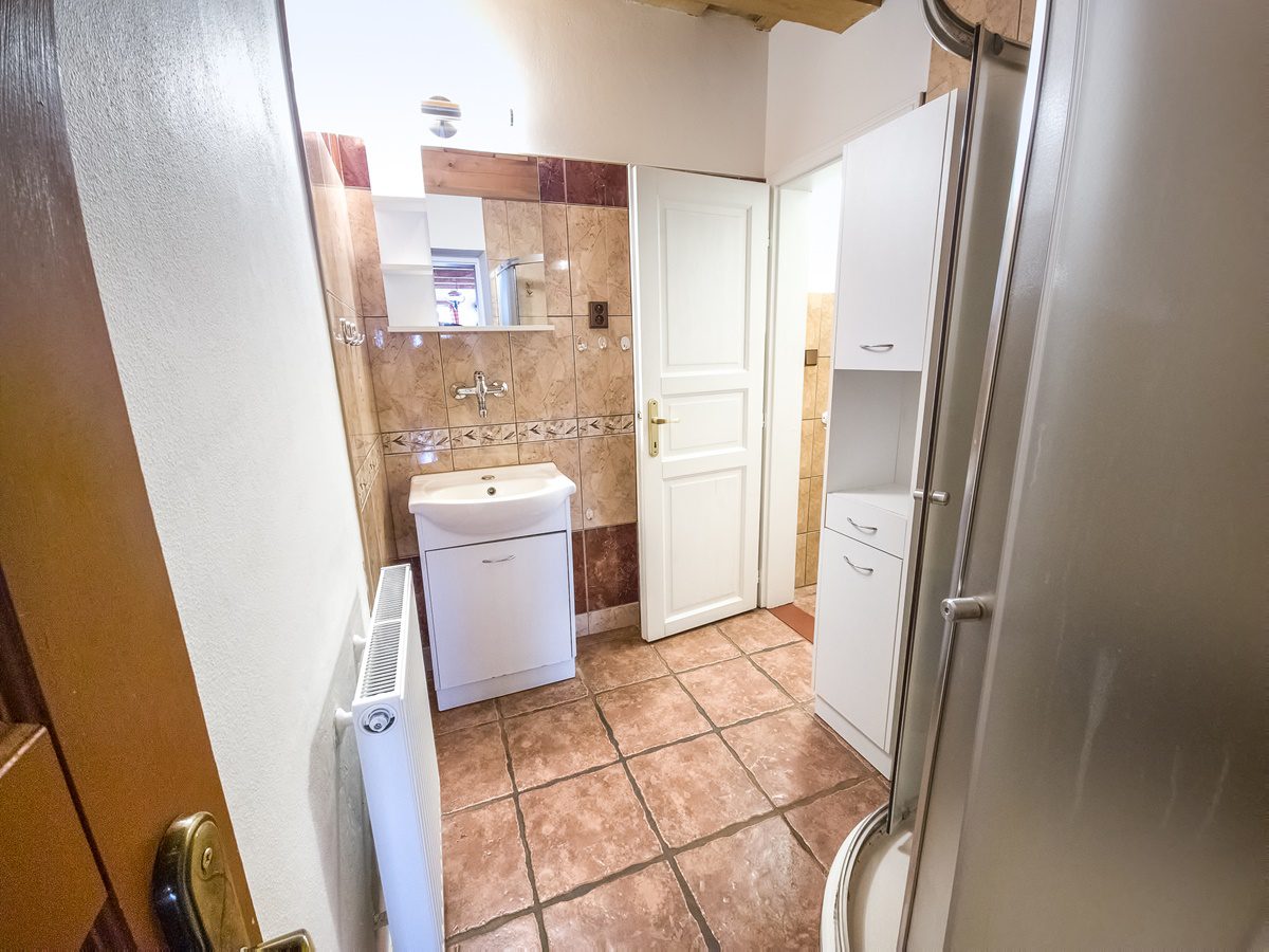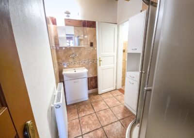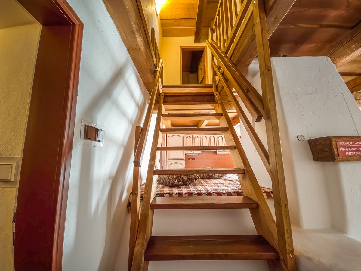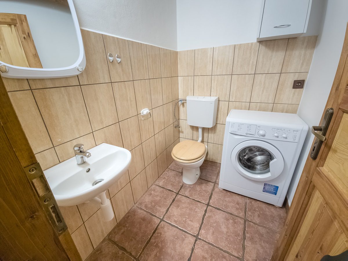 Přízemí – velký obývací pokoj s krbem a pecí na ležení, prostorná a plně vybavená kuchyňská linka, jídelní kout a také odpočinková část včetně sedací soupravy. Z této centrální části je vchod do koupelny se sprchou, umyvadlem a samostatným WC.