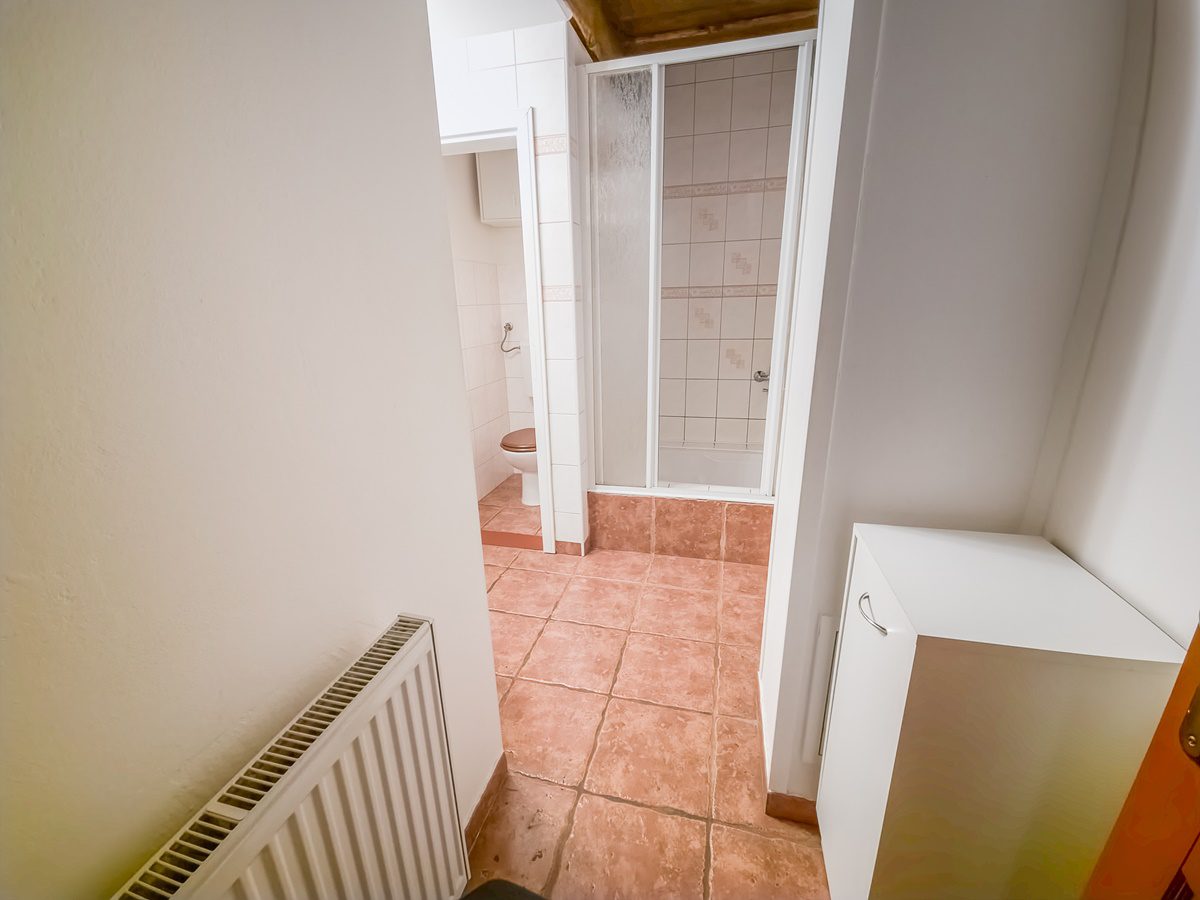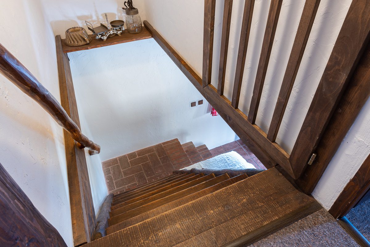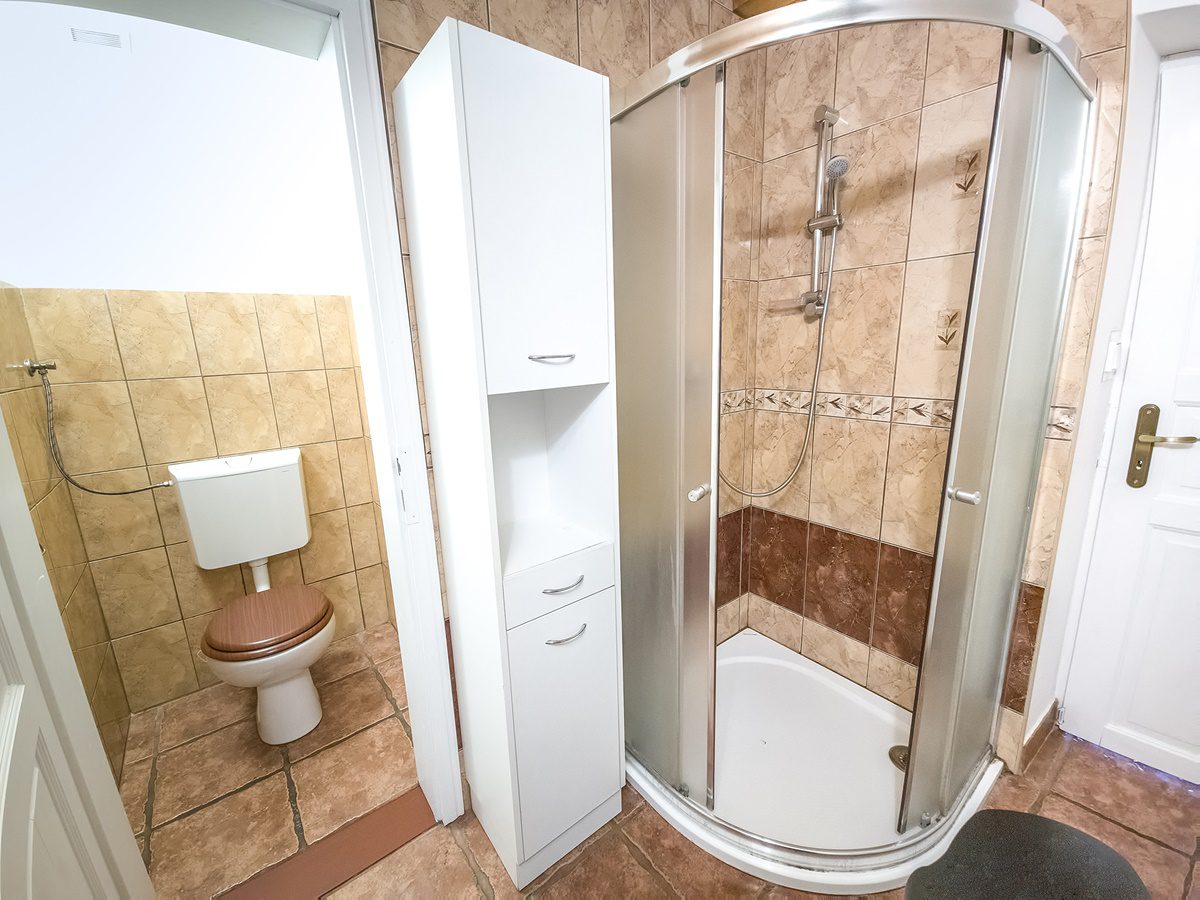 Přízemí – velký obývací pokoj s krbem a pecí na ležení, prostorná a plně vybavená kuchyňská linka, jídelní kout a také odpočinková část včetně sedací soupravy. Z této centrální části je vchod do koupelny se sprchou, umyvadlem a samostatným WC.