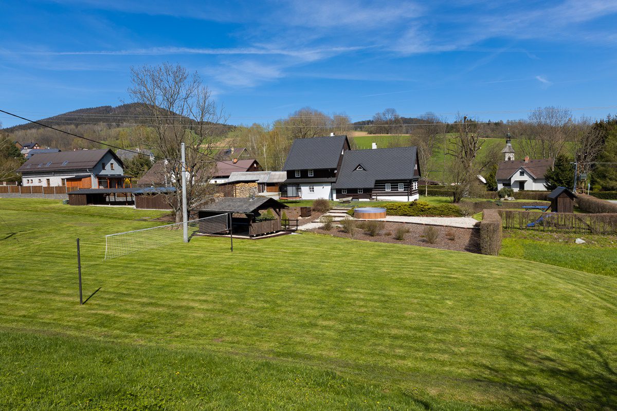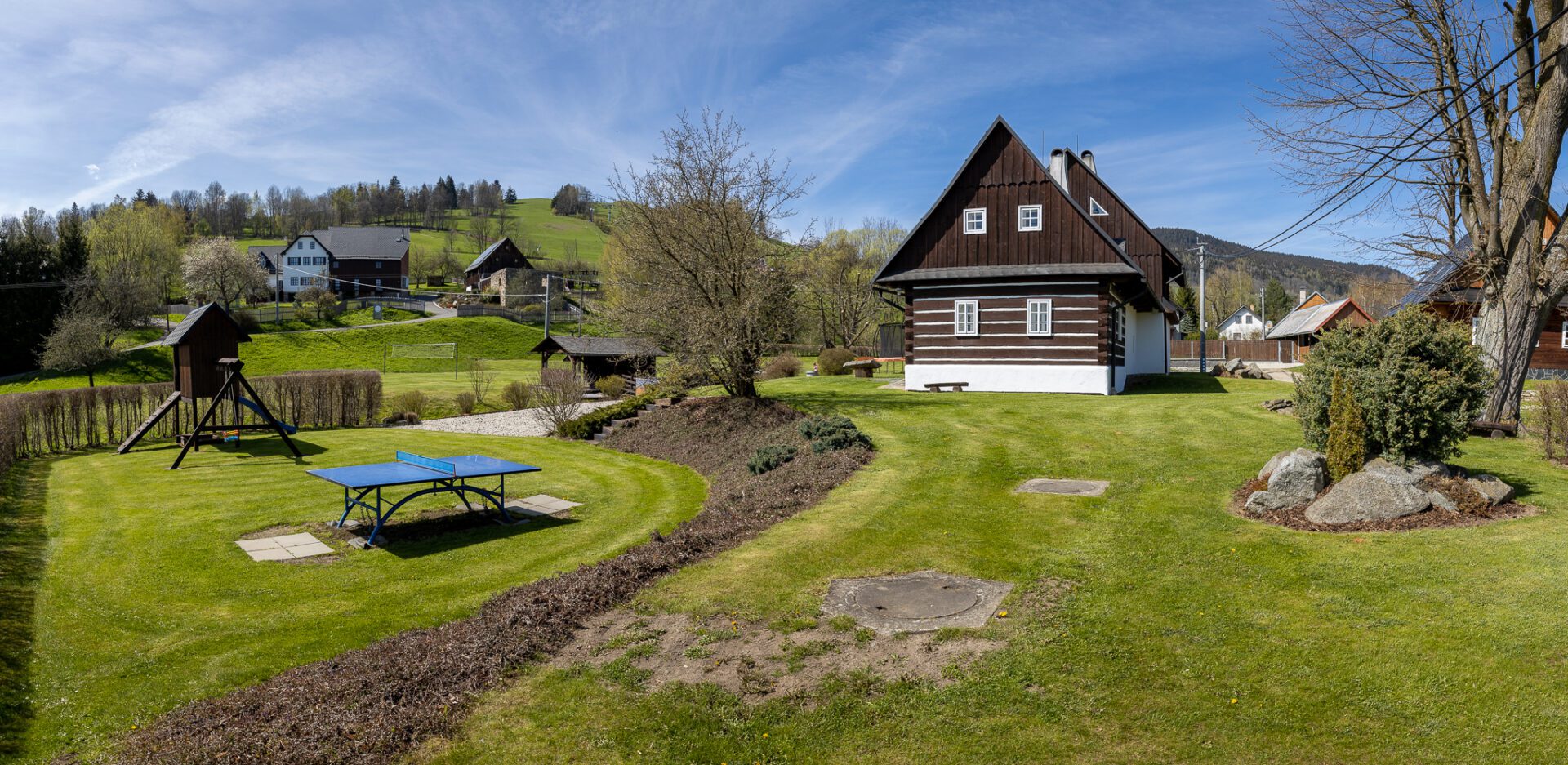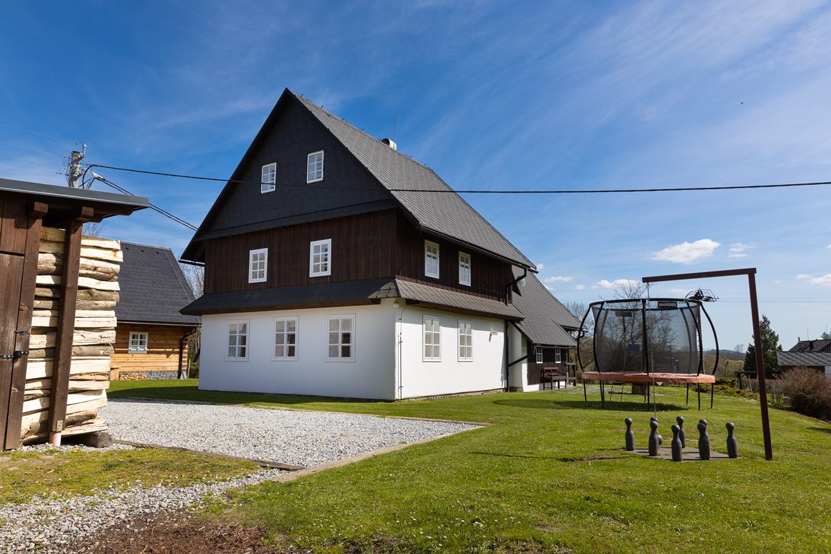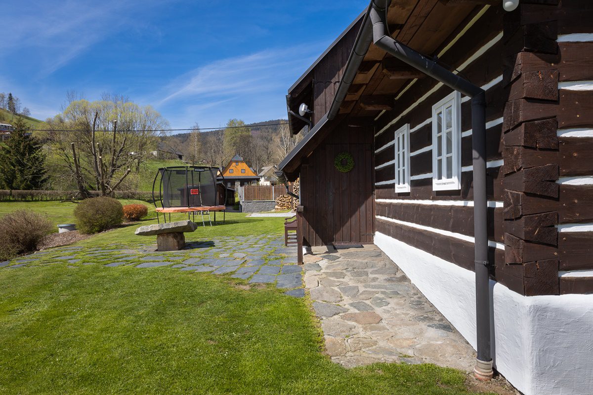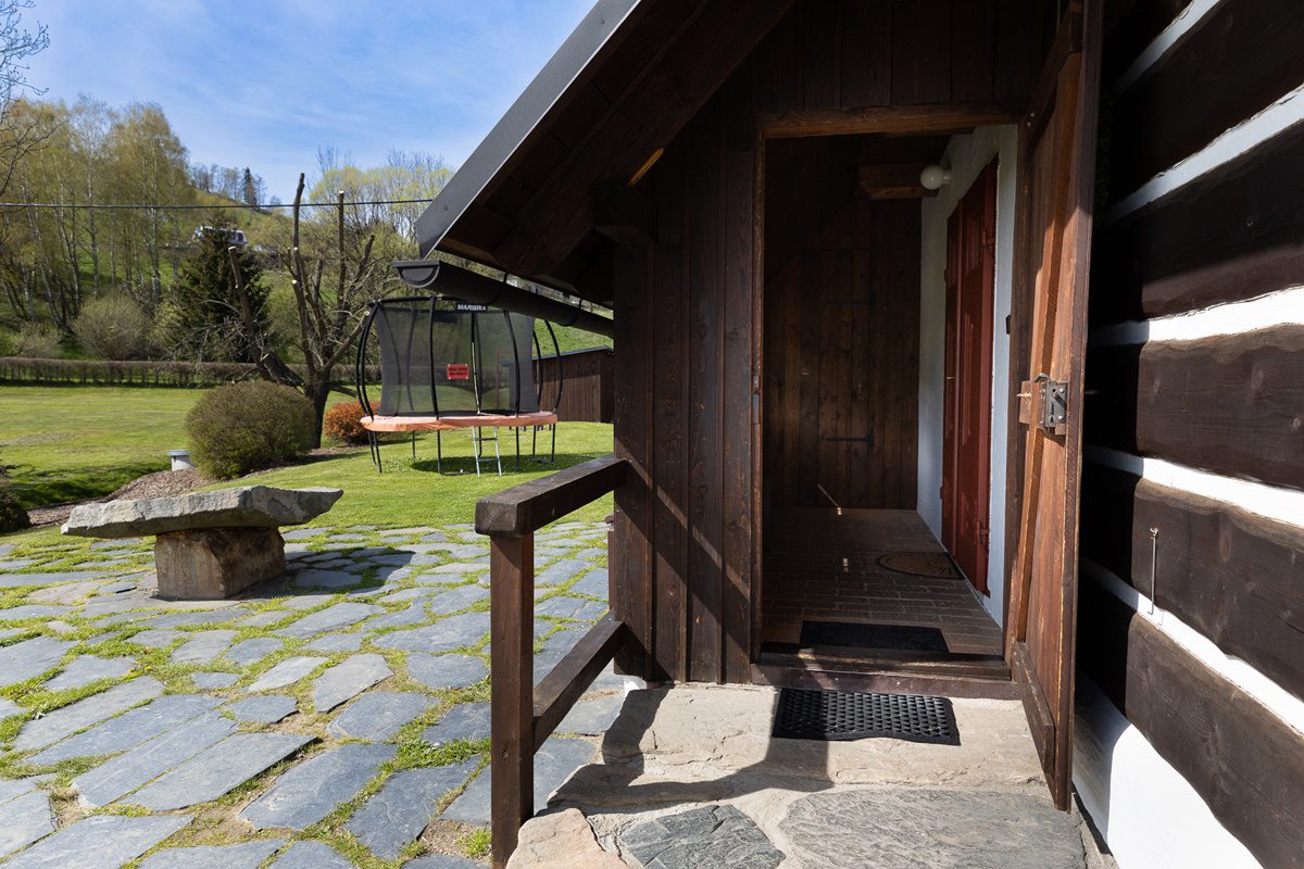 Zahradní posezení u chalupy a sportovní vyžití je opravdu bohaté. K dispozici zde máme nadzemní bazén se solárním ohřevem, pergolu s posezením a grilovacím roštem, dále posezení s kamenným stolem, lavicí a židlemi, dětskou prolézačku s houpačkou, pískoviště, kuželky, trampolínu, dětskou skluzavku a malý nafukovací bazén. Nově je také možnost využít krásné upravené volejbalové hřiště náležící k chalupě.