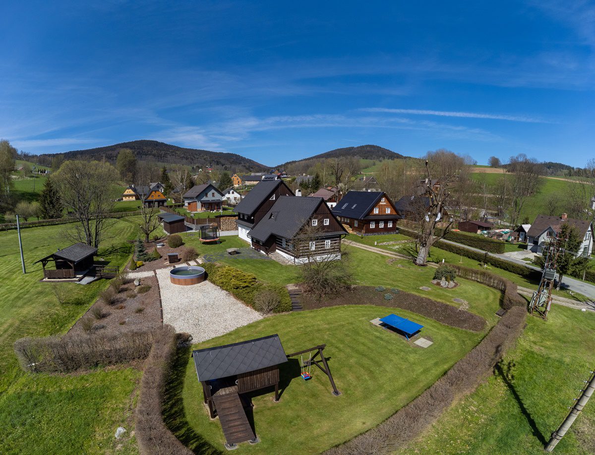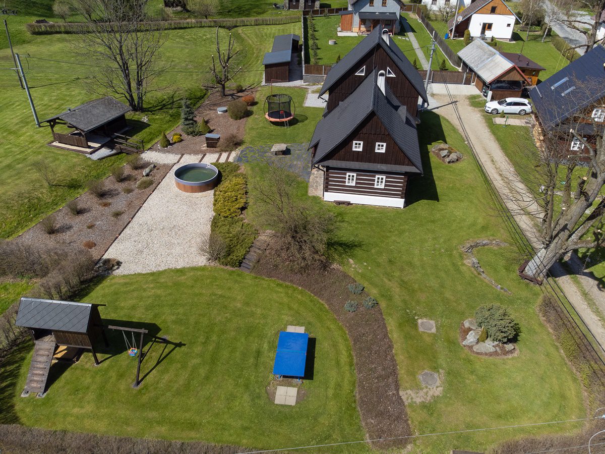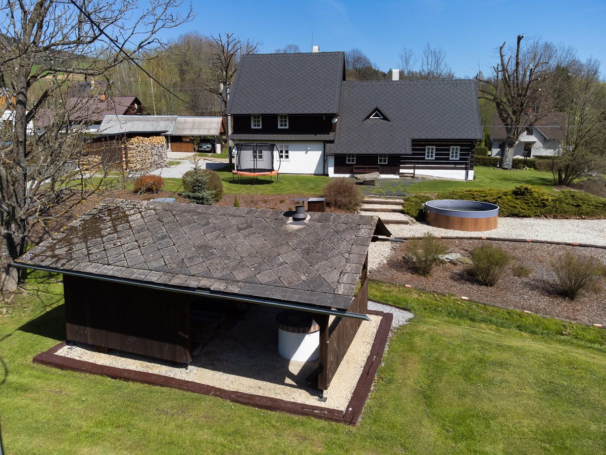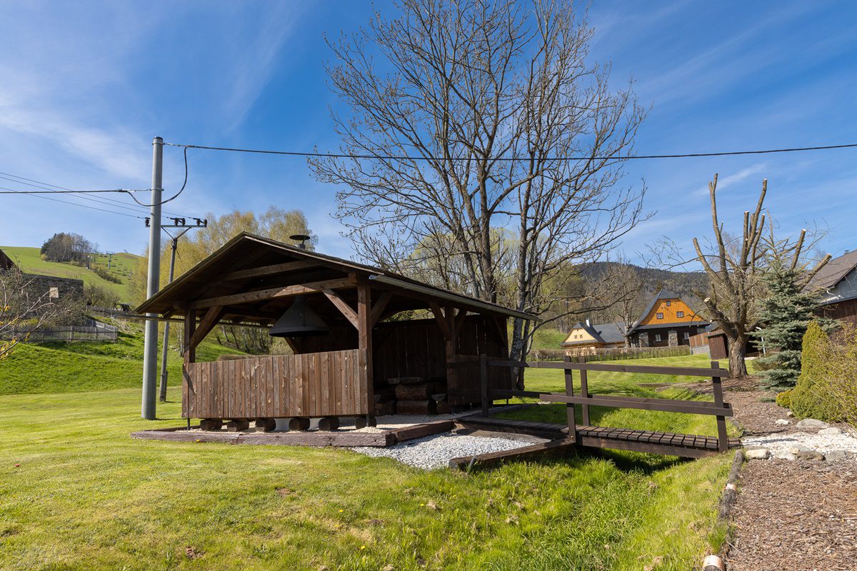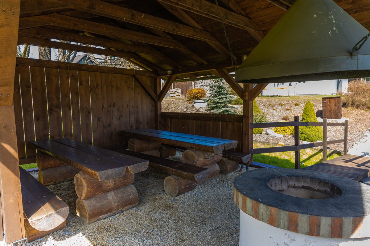 Zahradní posezení u chalupy a sportovní vyžití je opravdu bohaté. K dispozici zde máme nadzemní bazén se solárním ohřevem, pergolu s posezením a grilovacím roštem, dále posezení s kamenným stolem, lavicí a židlemi, dětskou prolézačku s houpačkou, pískoviště, kuželky, trampolínu, dětskou skluzavku a malý nafukovací bazén. Nově je také možnost využít krásné upravené volejbalové hřiště náležící k chalupě.