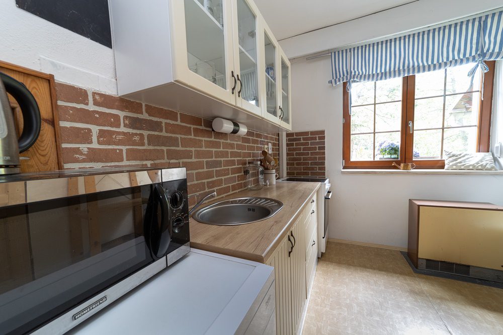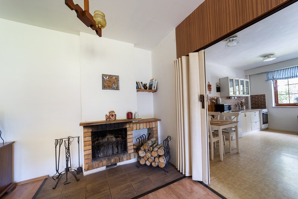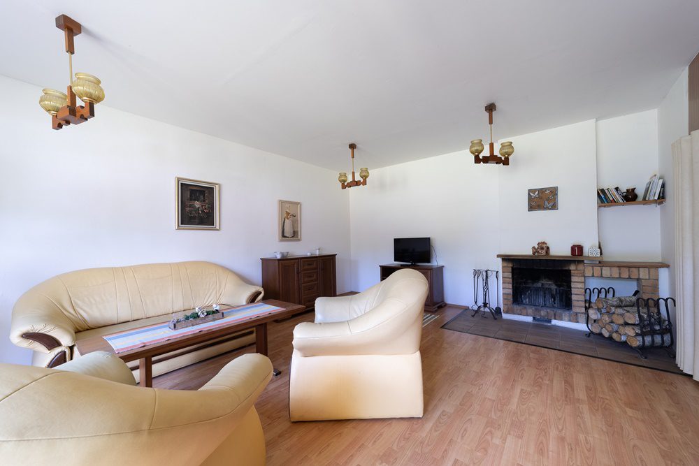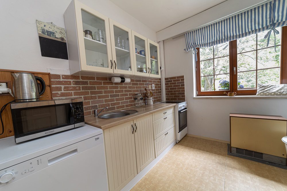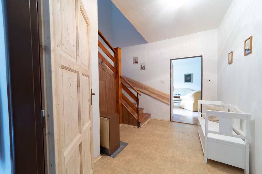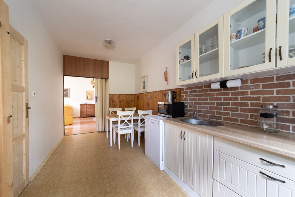 Přízemí /56 m2/ – zádveří, technická místnost, WC, schodiště, předsíň, obývací pokoj se vstupem na vlastní terasu a rozkládací pohovkou a plně vybavená kuchyně