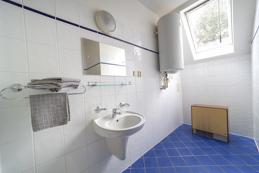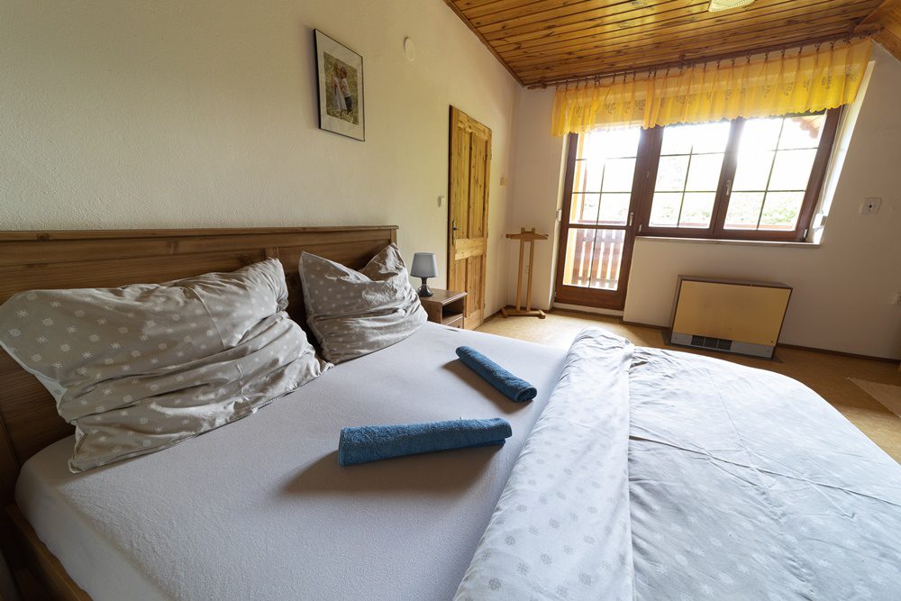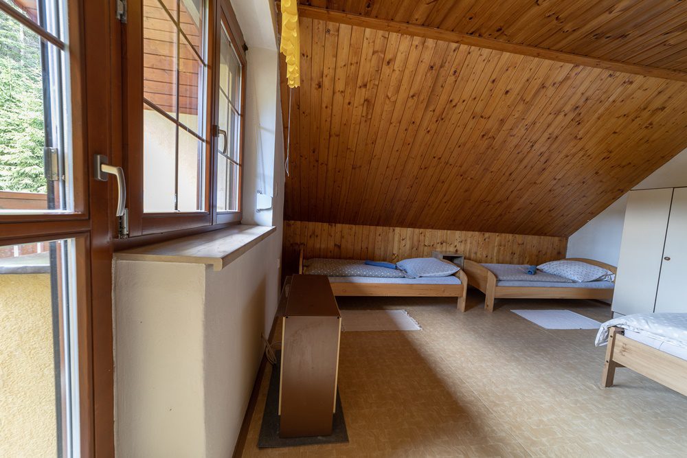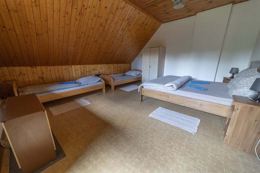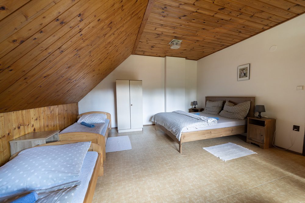 Podkroví – sklad, předsíň, samostatné WC, prostorná koupelna a čtyřlůžková ložnice s přímým vstupem na balkon