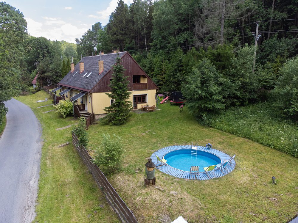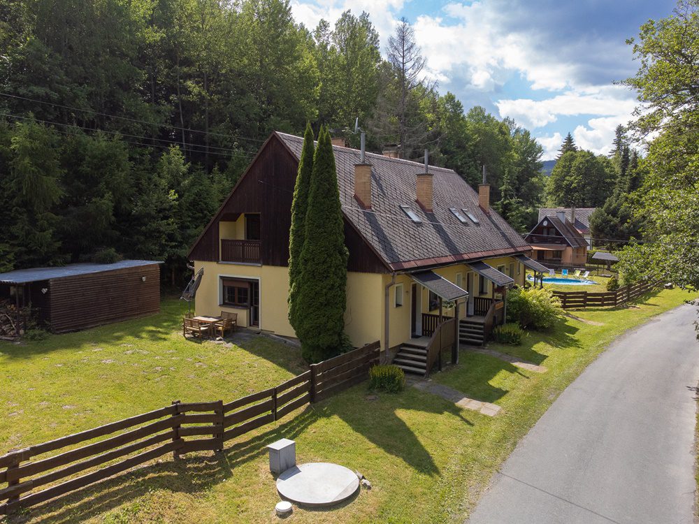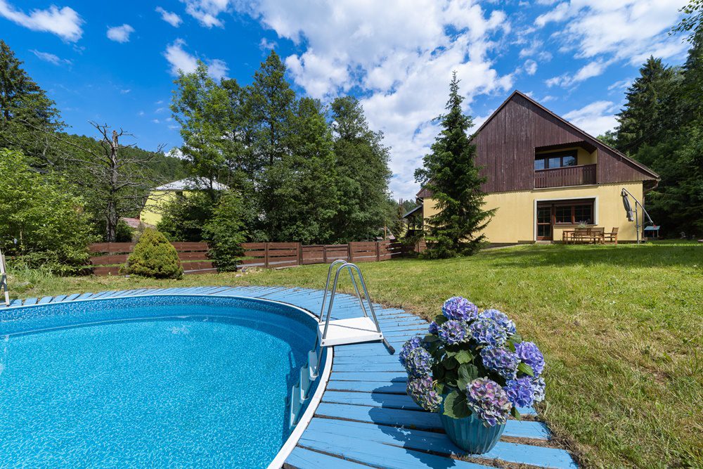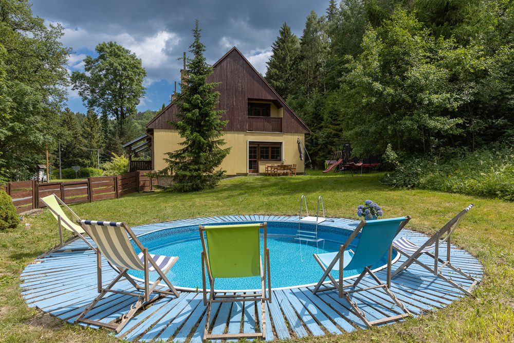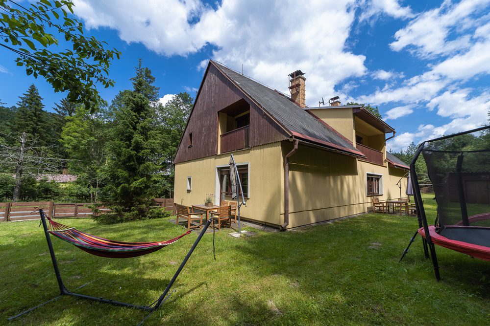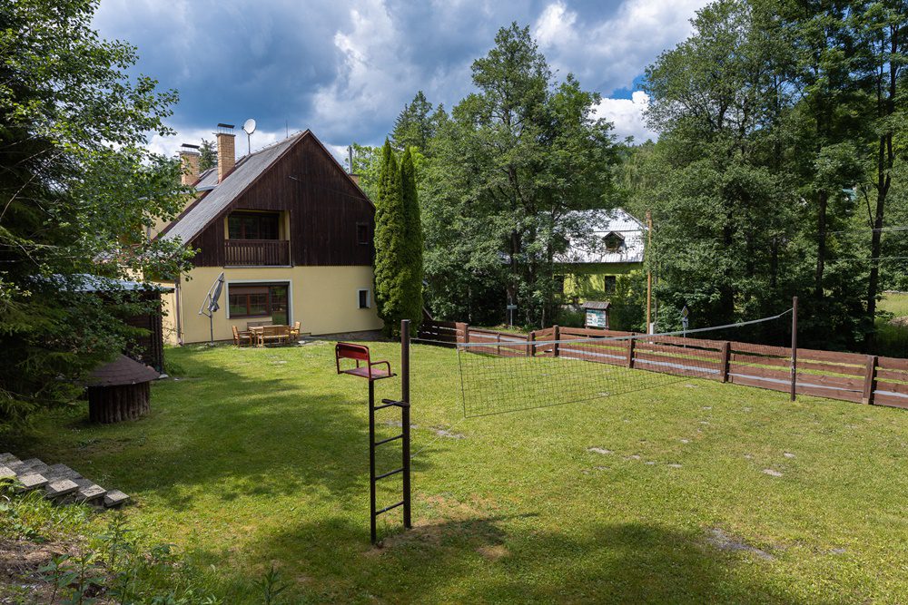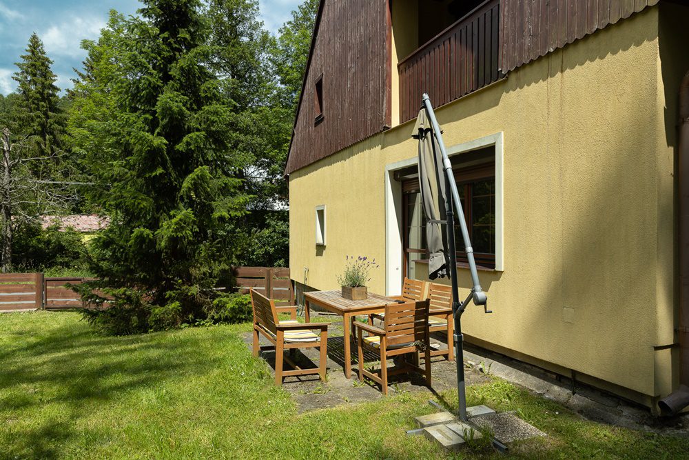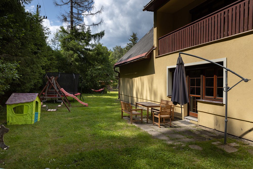 Zahradní posezení u chaty a sportovní vyžití pro všechny apartmány je opravdu bohaté. Chata je obklopena velikou zahradou, která postupně přechází v les. Zahrada umožňuje jak sportovní vyžití (víceúčelové hřiště, trampolína, dětské zázemí, houpačky, venkovní bazén vyhřívaný tepelným čerpadlem) tak i odpočinek nebo posezení u krbu s udírnou.