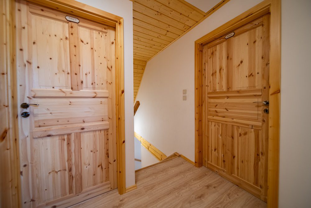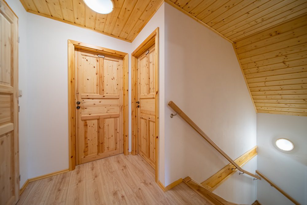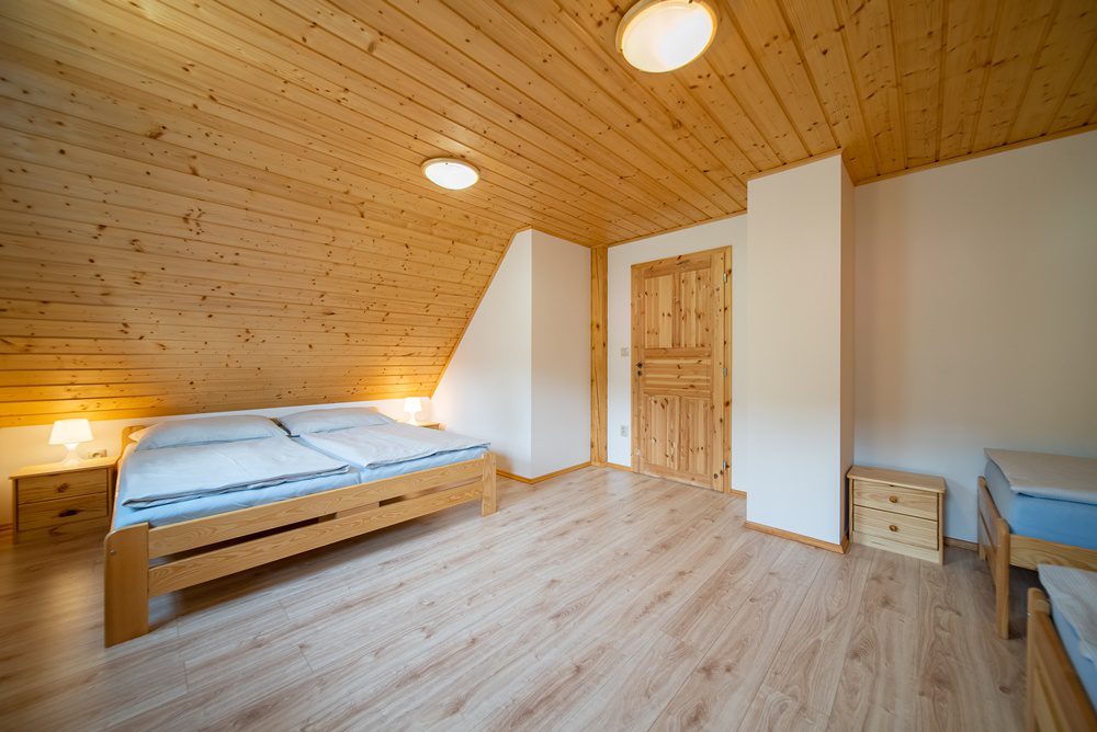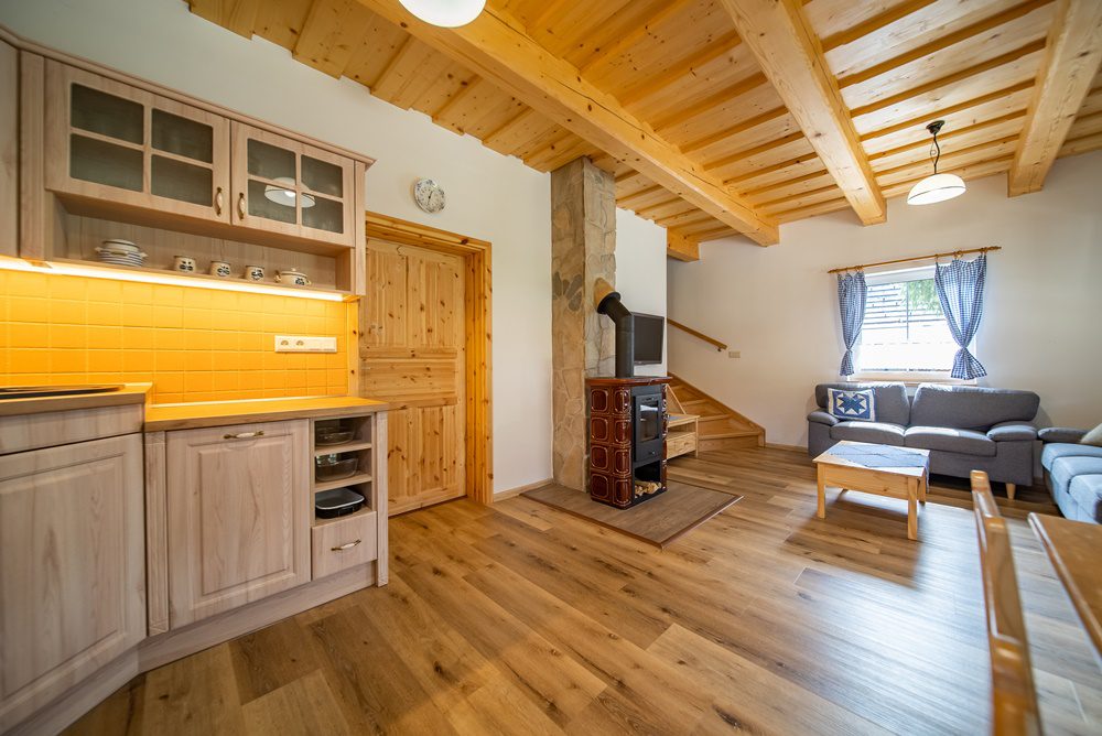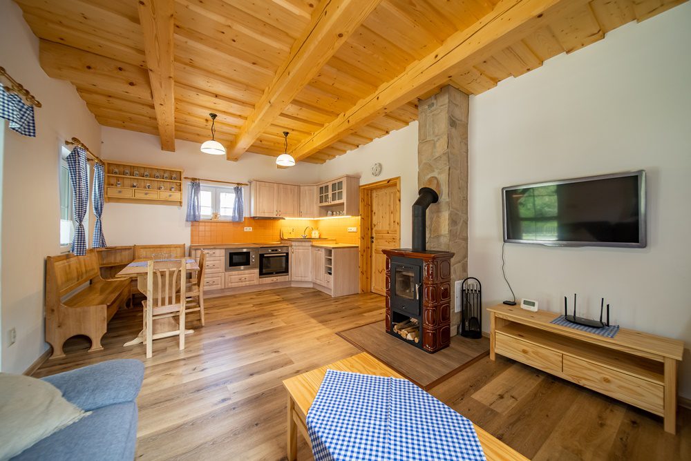 Vytápění celého domu je řešeno podlahovým teplovodním topením, které ohřívá elektrokotel s termostatem. Další a velmi příjemnou možností vytápění jsou keramická krbová kamna, která jsou umístěna v obývacím pokoji. Ohřev vody je zajištěn prostřednictvím elektrického bojleru o objemu 160 l, který je velmi šikovně instalován v technické místnosti. Veškeré interiérové dveře včetně zárubní jsou z masivního smrkového dřeva. Podlahy v 1.NP jsou vinylové v kombinaci s keramickou dlažbou a podkrovní podlahy pokrývá laminátová podlaha.