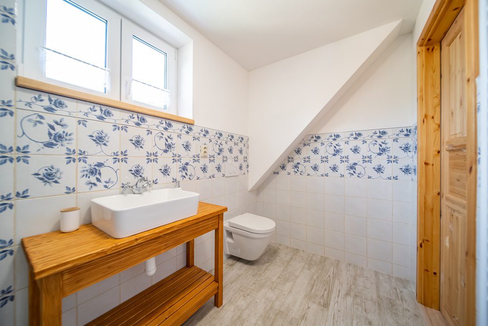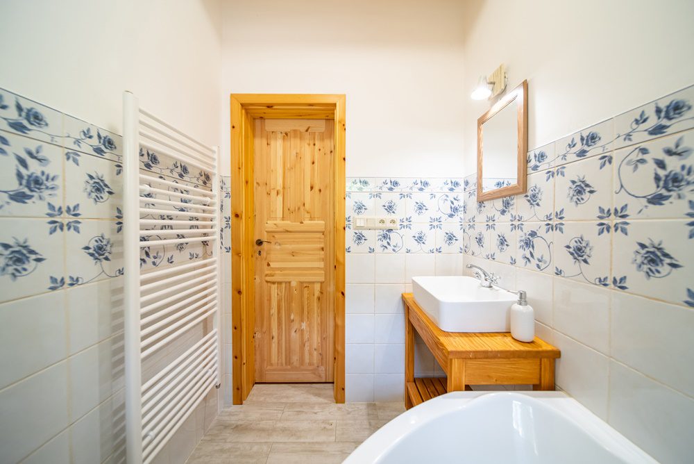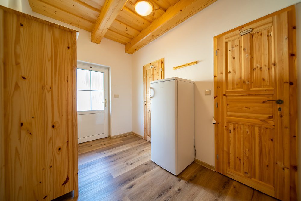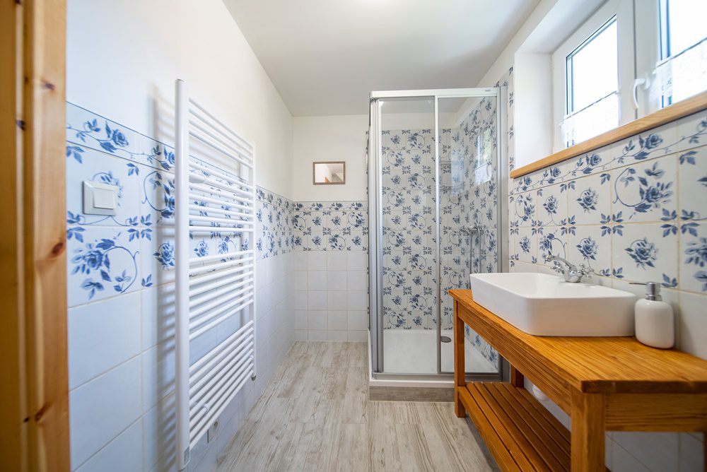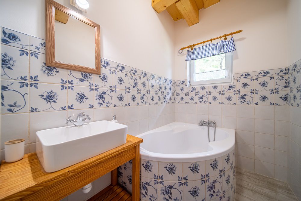 Vytápění celého domu je řešeno podlahovým teplovodním topením, které ohřívá elektrokotel s termostatem. Další a velmi příjemnou možností vytápění jsou keramická krbová kamna, která jsou umístěna v obývacím pokoji. Ohřev vody je zajištěn prostřednictvím elektrického bojleru o objemu 160 l, který je velmi šikovně instalován v technické místnosti. Veškeré interiérové dveře včetně zárubní jsou z masivního smrkového dřeva. Podlahy v 1.NP jsou vinylové v kombinaci s keramickou dlažbou a podkrovní podlahy pokrývá laminátová podlaha.