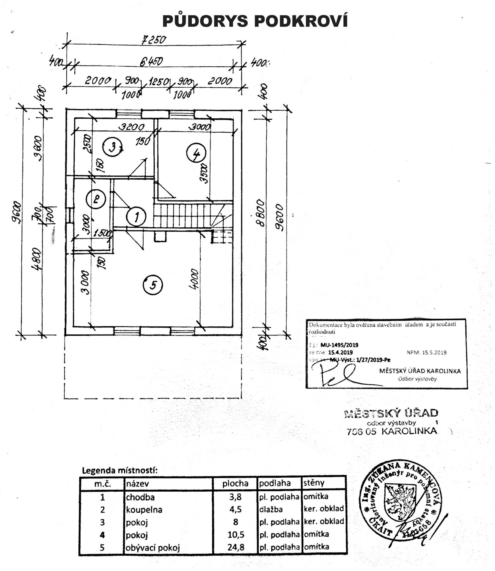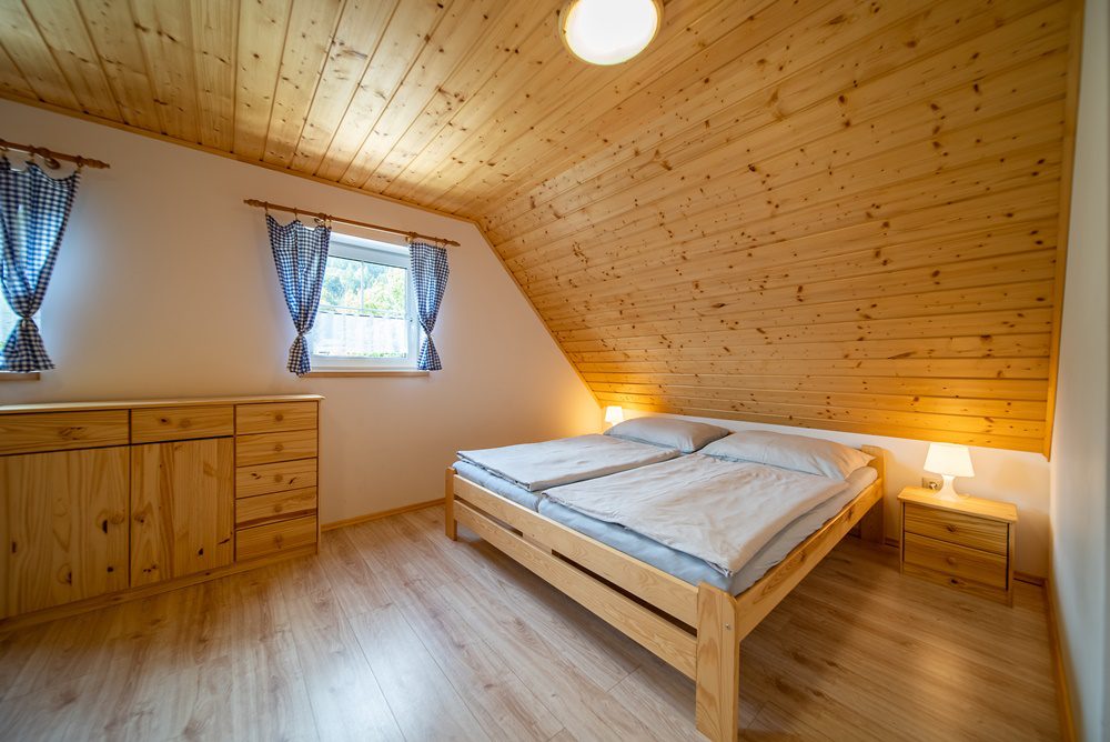 První nadzemní podlaží je tvořeno prostorným obývacím pokojem s vybavenou kuchyňskou linkou včetně vestavných elektrospotřebičů, koupelnou osazenou vanou a umývadlem, technickou místností s toaletou, vstupní halou a samostatným pokojem. Po schodišti z jasanového dřeva vystoupáme do podkroví, kde najdeme tři samostatné pokoje, koupelnu se sprchovým koutem a další toaletou.